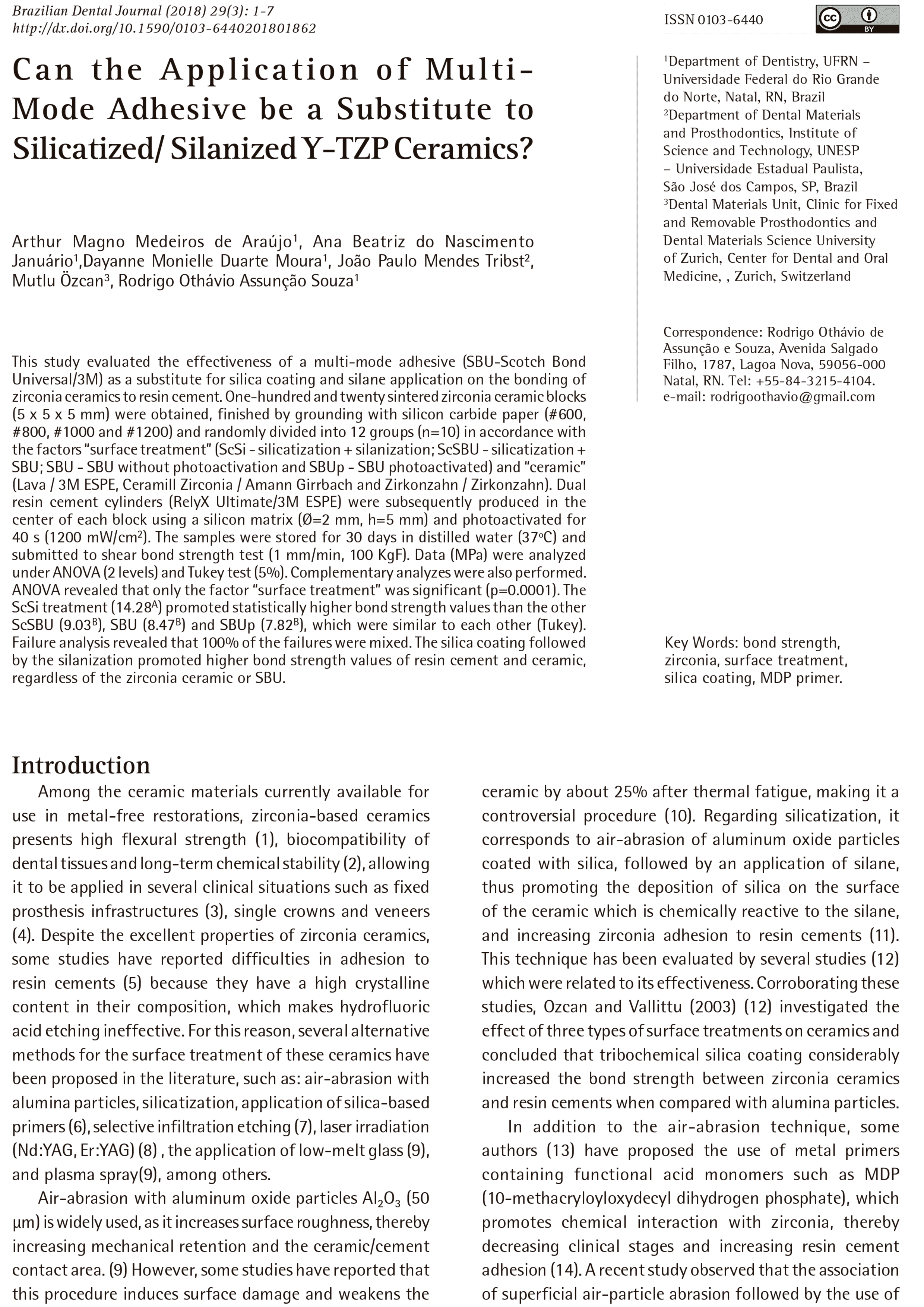 Silicatized/Silanized Y-TZP Ceramics?. BRAZILIAN DENTAL JOURNAL, v. 29, p. 275-281, 2018.